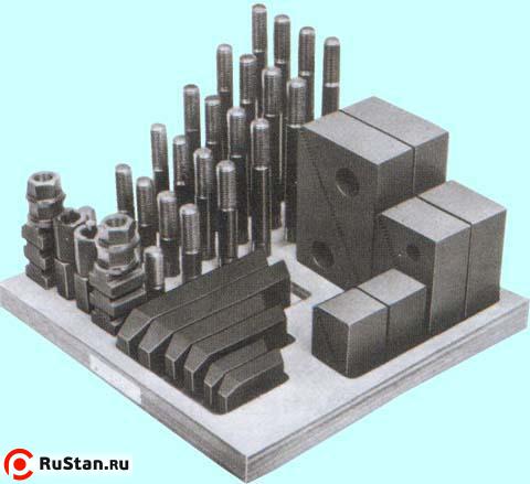 Набор предназначен для фиксации заготовок, деталей сложной формы при дальнейшей обработке на фрезерных, сверлильных и других станках , имеющих ширину паза 13.7-14мм на столе. В набор клиновых прижимов входят: Сухари (резьба М12х1,75) для станочных пазов 13.7мм- 6 шт. Гайка М12х1,75 с буртиком - 4 шт. Гайка М12х1,75 высокая - 4 шт. Клиновые опоры с рифлением - 6 шт. Прихват плоский с рифлением - 6 шт. Шпильки М12х1,75 длиной 75 мм - 4 шт. Шпильки М12х1,75 длиной 100 мм - 4 шт. Шпильки М12х1,75 длиной 125 мм - 4 шт. Шпильки М12х1,75 длиной 150 мм - 4 шт. Шпильки М12х1,75 длиной 175 мм - 4 шт. Шпильки М12х1,75 длиной 200 мм - 4 шт. Для удобства работы набор располагается на открытой деревянной подставке.