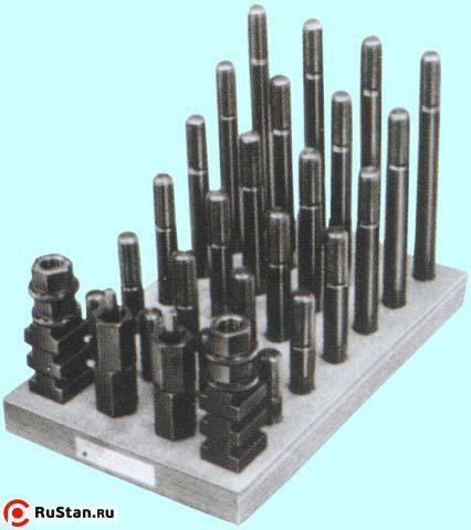 Набор предназначен для фиксации заготовок, деталей сложной формы при дальнейшей обработке на фрезерных, сверлильных и других станках , имеющих ширину паза 21.7-22мм на столе. В набор клиновых прижимов входят: Сухари (резьба М20х2,5) для станочных пазов 21,7мм - 8 шт. Гайка М20х2,5 с буртиком - 8 шт. Шпильки М20х2,5 длиной 100 мм - 4 шт. Шпильки М20х2,5 длиной 125 мм - 4 шт. Шпильки М20х2,5 длиной 150 мм - 4 шт. Шпильки М20х2,5 длиной 175 мм - 4 шт. Шпильки М20х2,5 длиной 200 мм - 4 шт. Шпильки М20х2,5 длиной 250 мм - 4 шт Для удобства работы набор располагается на открытой деревянной подставке.