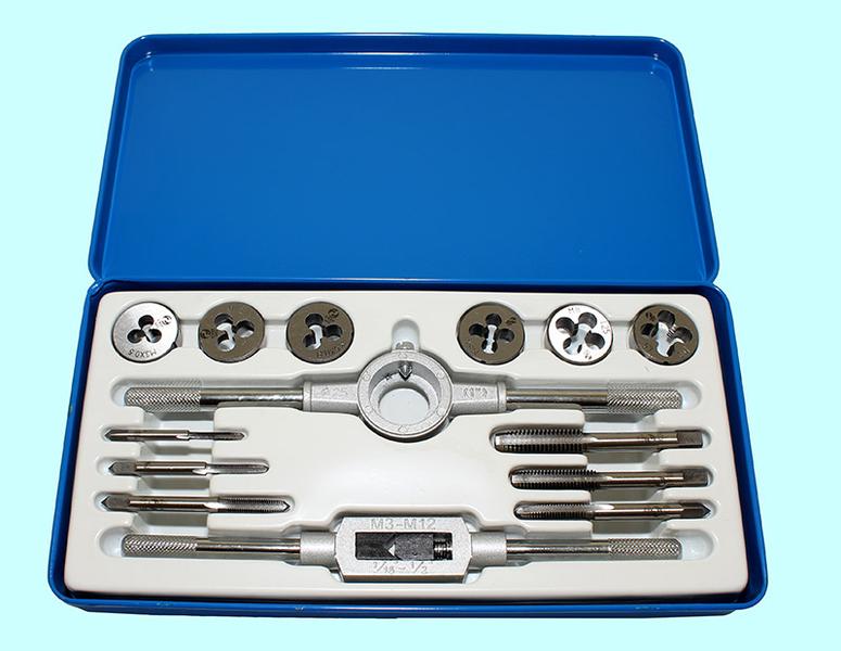 Комплектация набора: плашки круглые M3x0.5, M4x0.7, M5x0.8, M6x1, M8x1.25, M10x1.5, M12x1.75; плашкодержатель М3-М12.