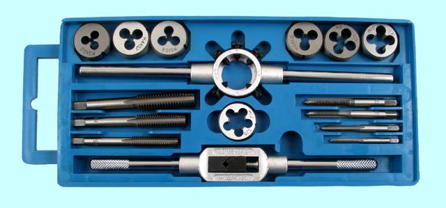 Вороток,плашкодержатель и по 20 метчиков и плашек М6-М24 в мет. коробке (45 позиций)