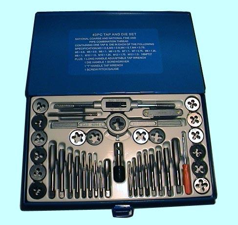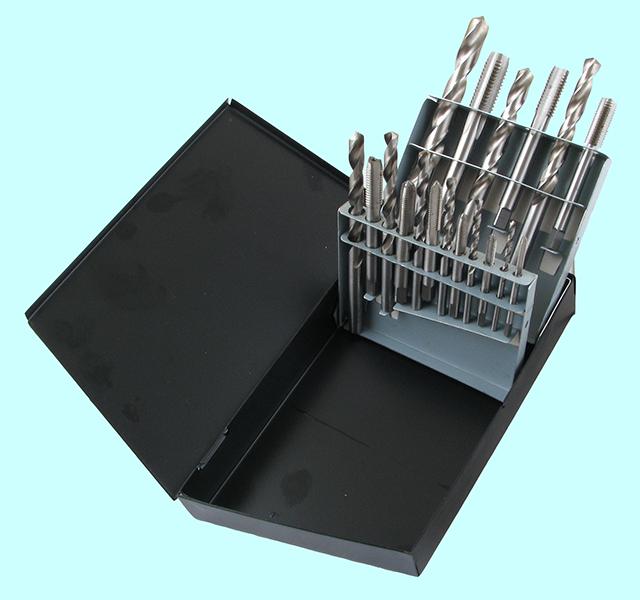 Комплектация: метчики однопроходные М3х0.5, М4х0.7, М5х0.8, М6х1.0, М8х1.25, М10х1.5, М12х1.75мм; сверла ц/х d2.5, d3.3, d4.2, d5.0, d6.8, d8.5, d10.3мм.