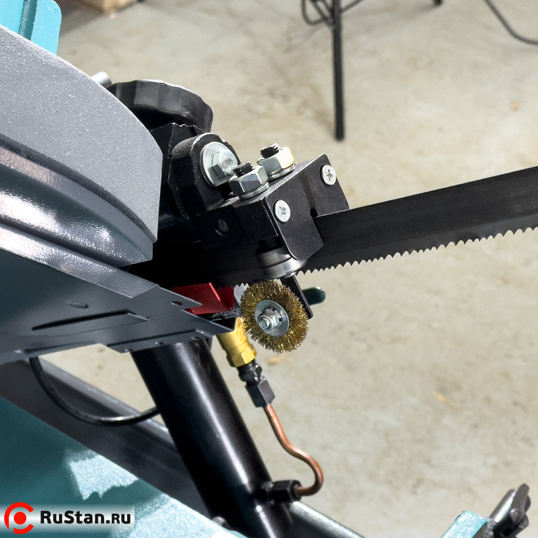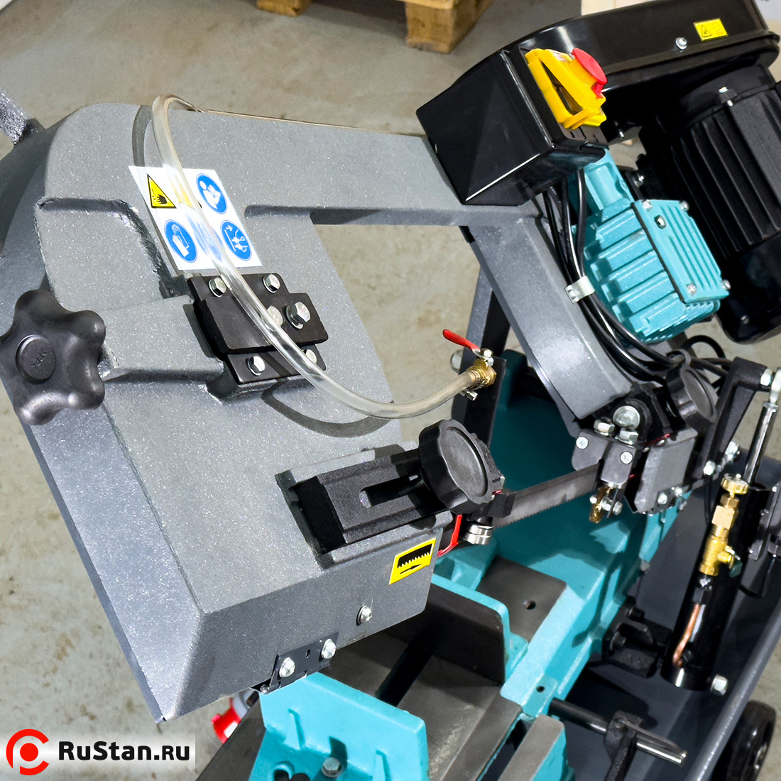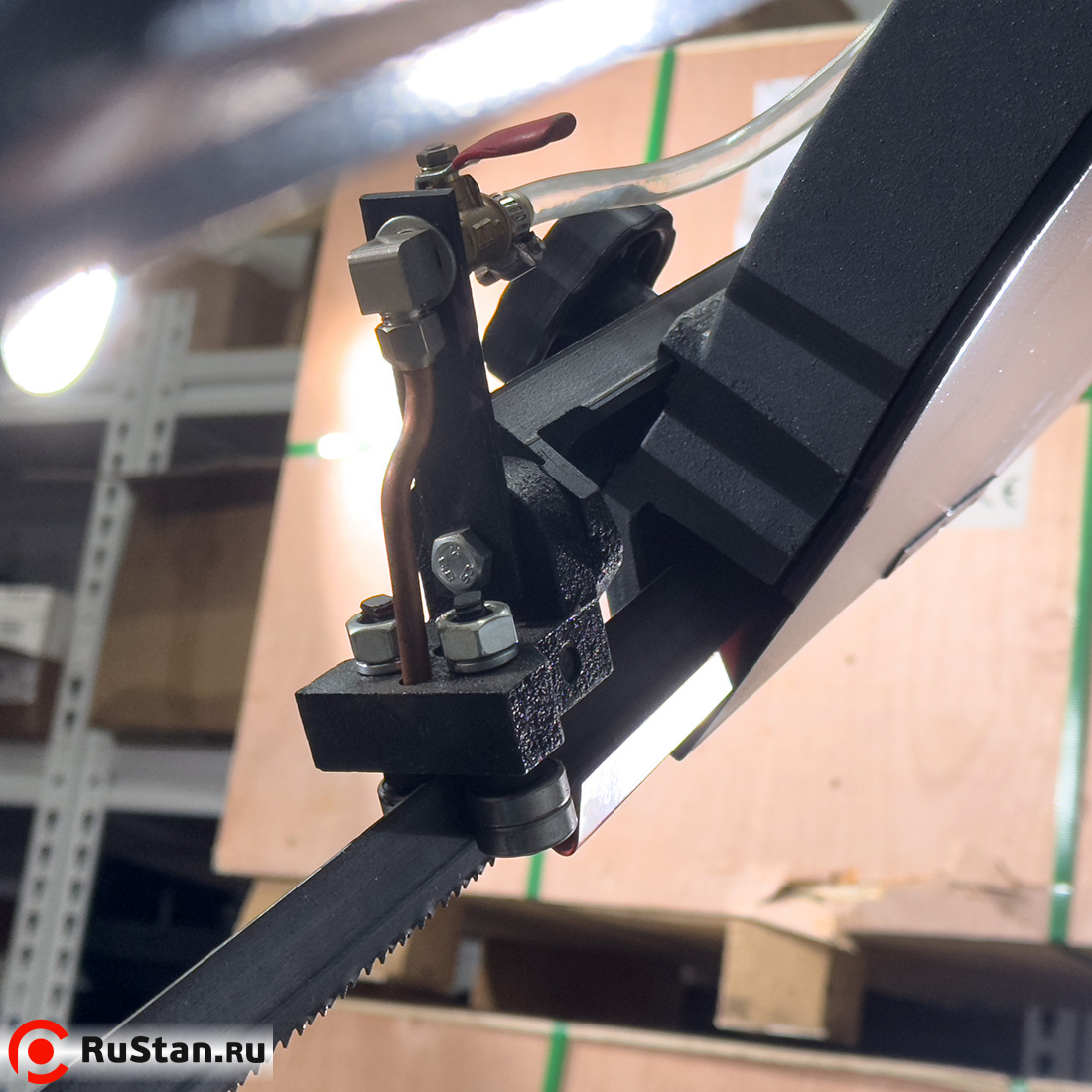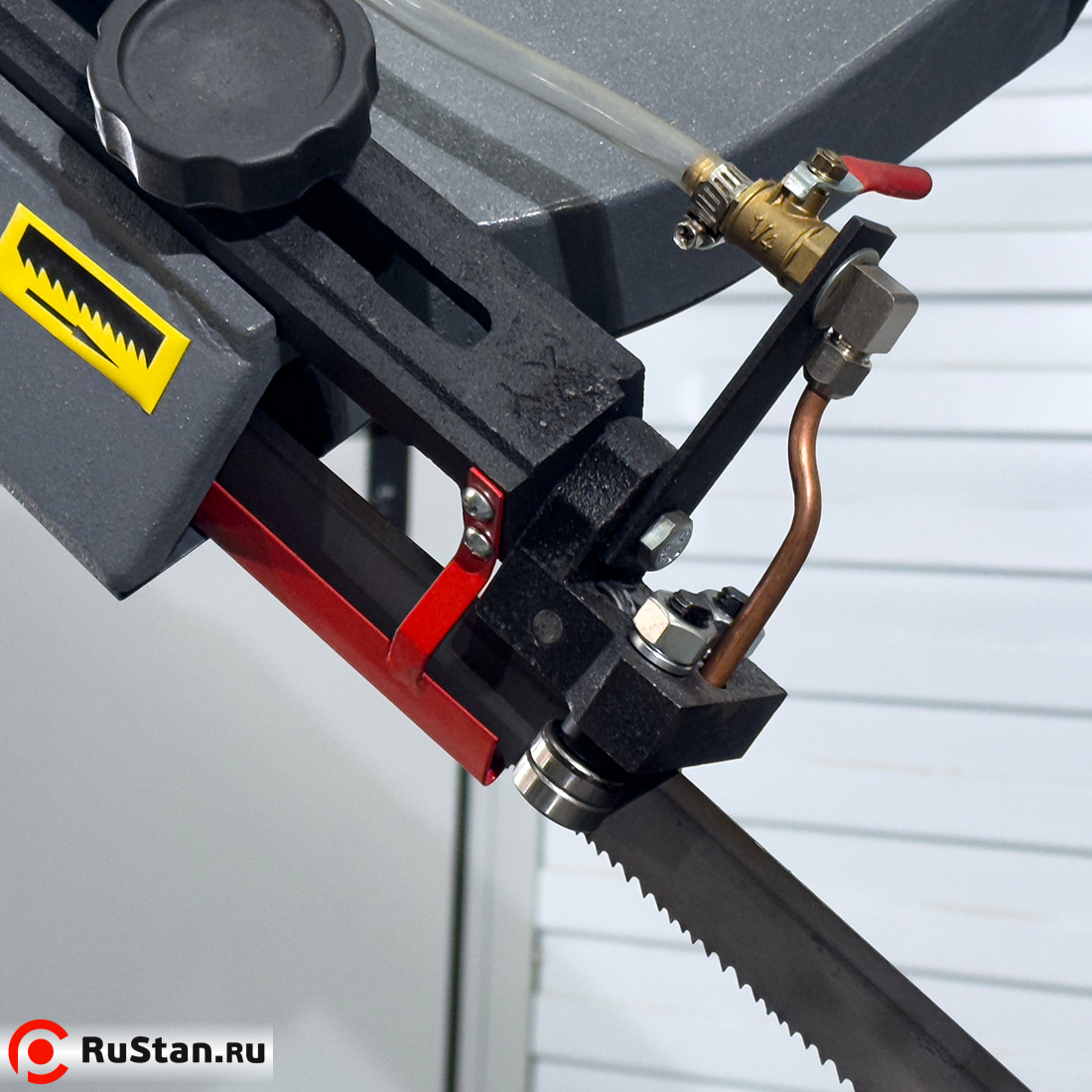 Скорость опускания пильной рамы регулируется гидроцилиндром. Модель оснащена системой подачи в зону резания смазочно-охлаждающей жидкости (СОЖ).