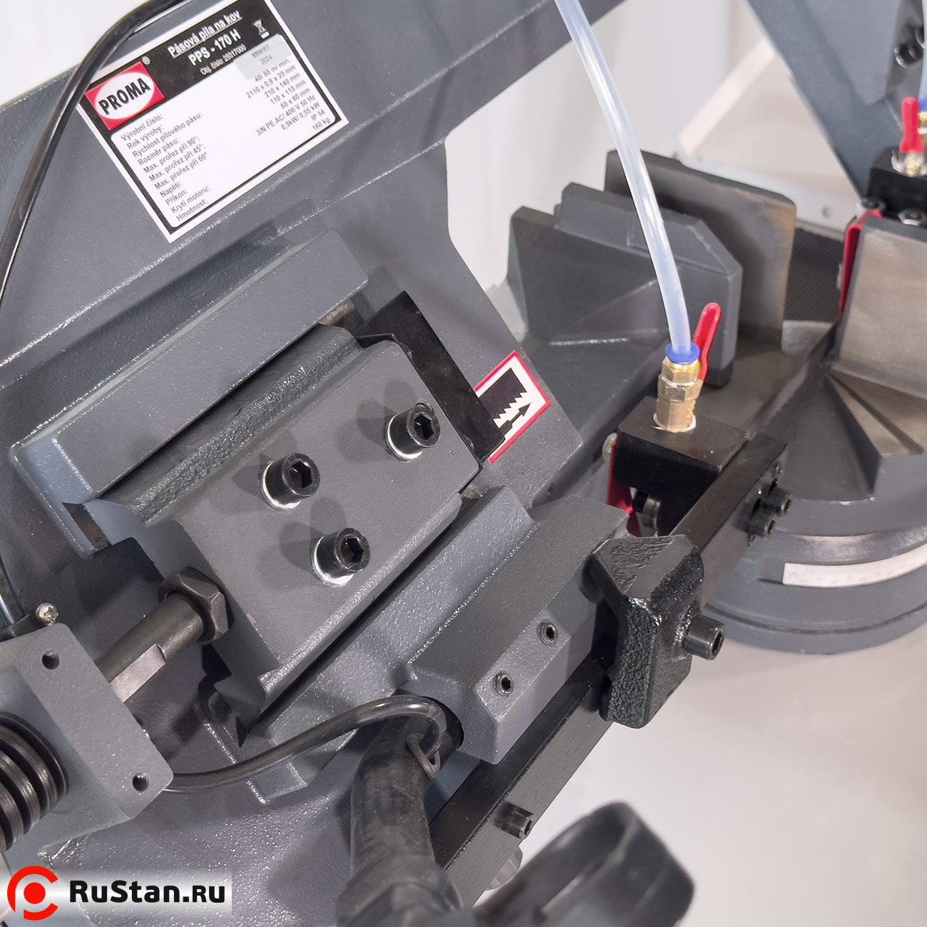 PPS-170H состоит из чугунных деталей с металлическими кожухами. Эта комбинация материалов обеспечивает достаточную жесткость станка при максимальном резе. Пилу можно настроить для резки под углом 90° / 60° / 45°. Пильная лента приводится в действие трёхфазным двигателем. Скорость опускания пильной рамы можно регулировать демпферным гидроцилиндром. Модель оснащена системой охлаждения СОЖ.