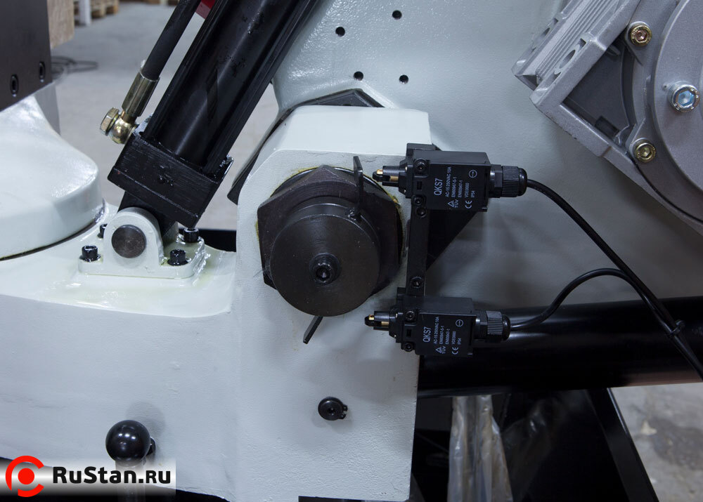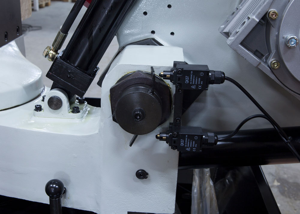- Предохрантельный концевик на кожухе маховика и концевик (под трёх-лучевым маховиком натяжения полотна) для контроля/отключения станка при обрыве полотна (оберегающие станок от поломок в случае если лента повреждена).