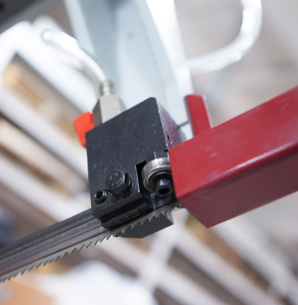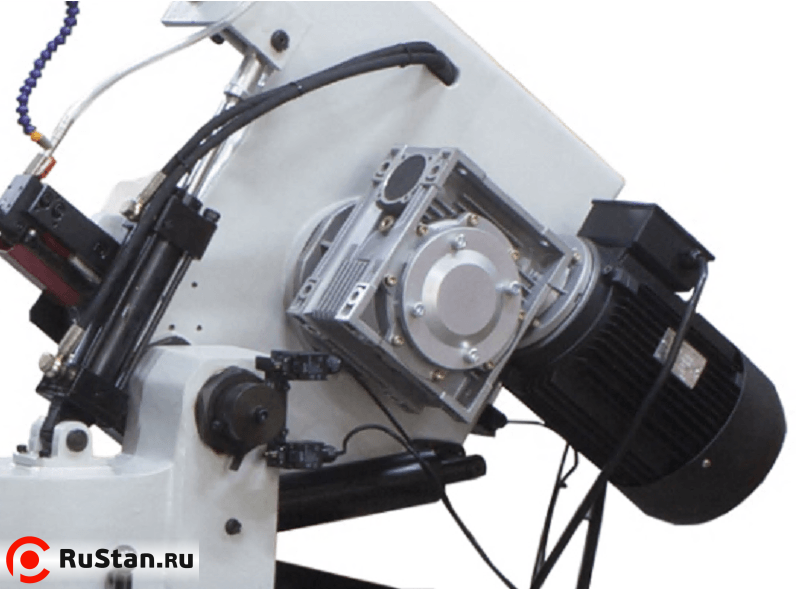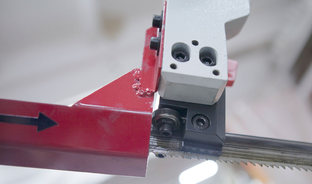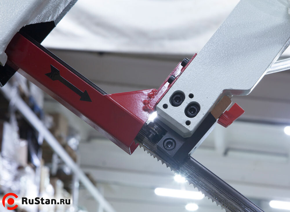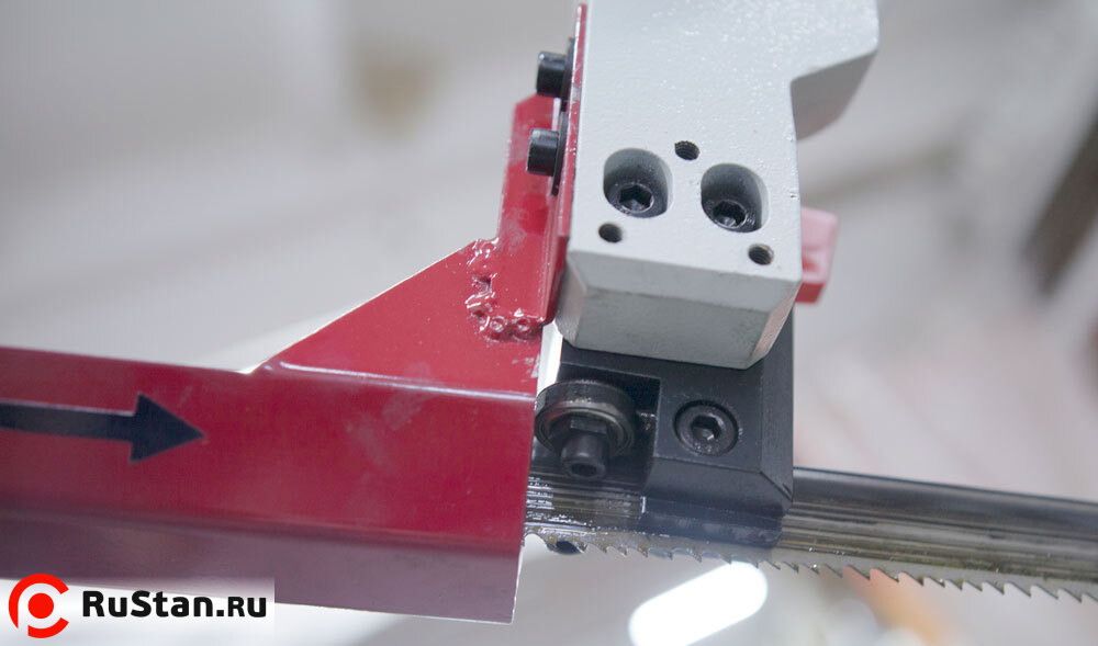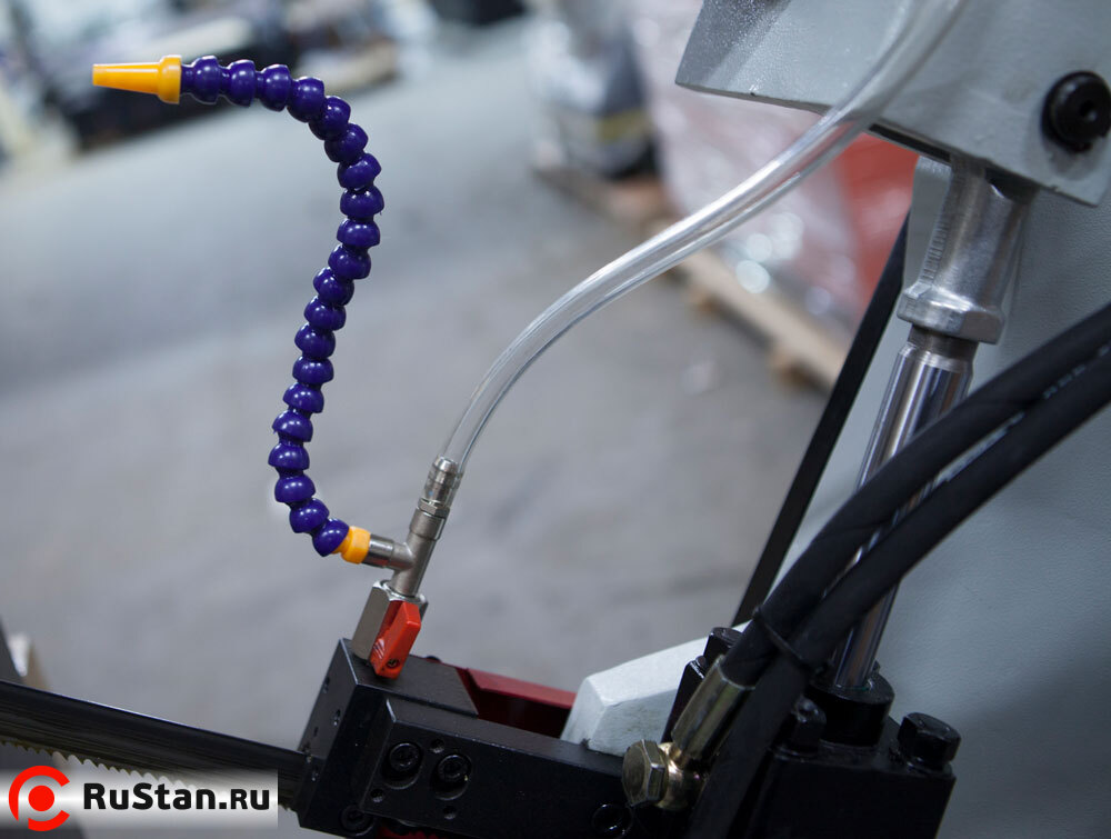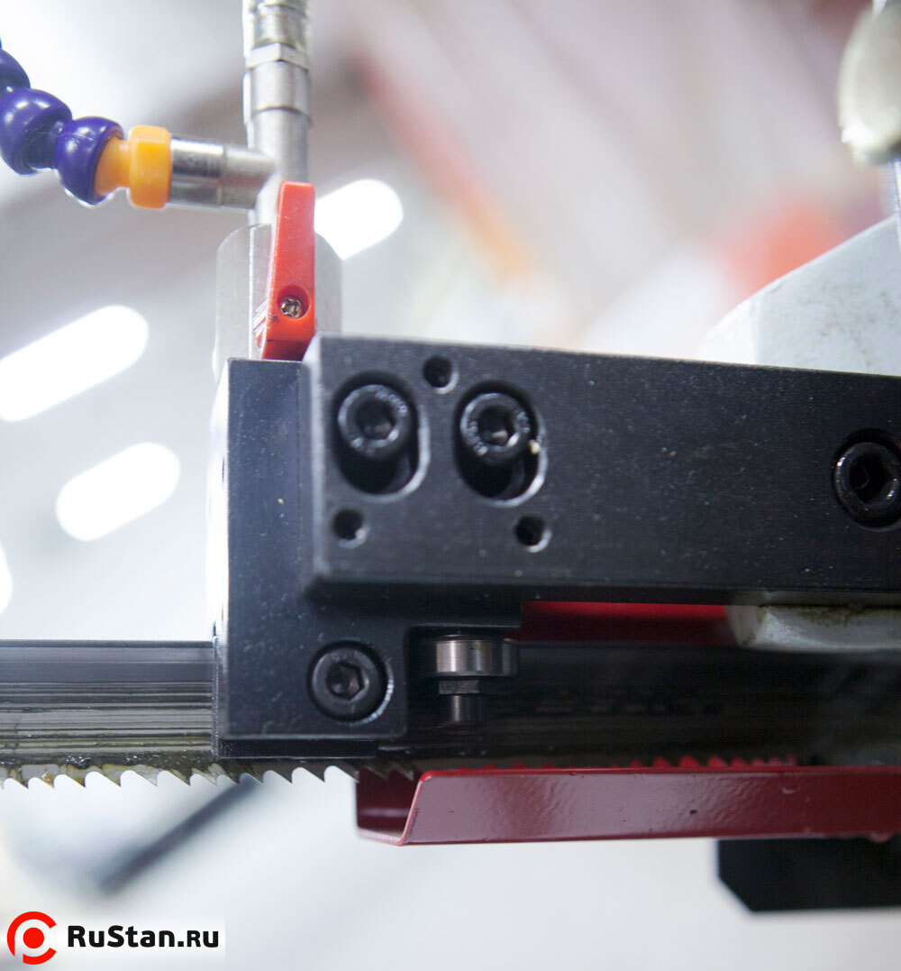 Подвижная направляющая и зубчатый блок, с твёрдосплавными платинами и подшипниками для выпрямления полотна в зоне резания и качественной фиксации для стабильного пиления. Гибкая трубка СОЖ с регулятором напора (фото №2). |