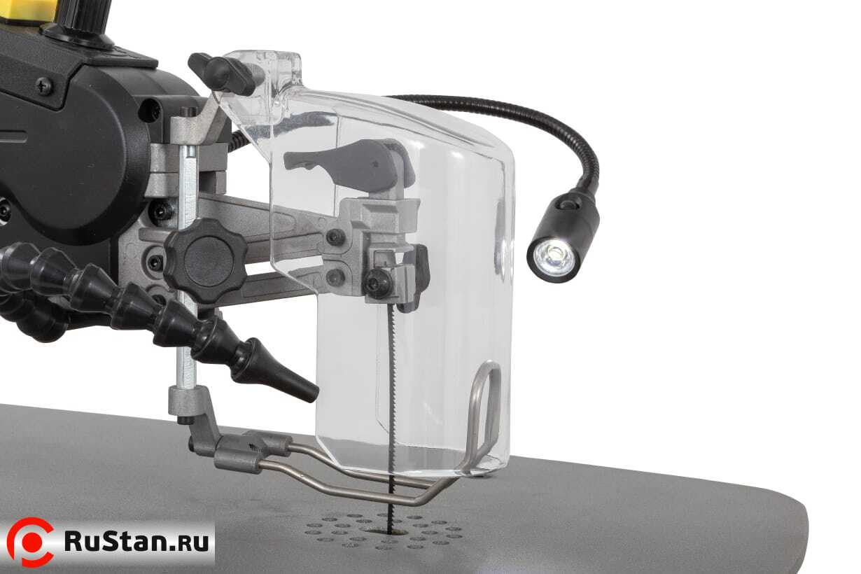 В этом станке можно использовать оба типа пилок, и со штифтами и прямые. Обдув зоны пиления через коленчатую трубку всегда можно расположить в месте, наиболее удобном для работы. Светильник подсветки тоже на гибкой стальной ноге. Он тоже не будет мешаться под руками, а будет подсвечивать именно в том месте, где он нужен. Верхнюю часть маятниковой рамы в работе можно легко поднимать в вернее положение для того, чтобы быстро продеть пилку через следующее отверстие и продолжить пилить.
