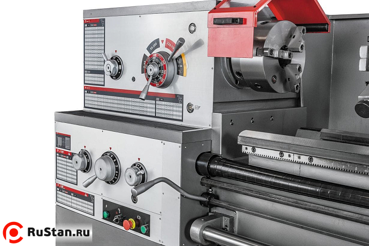 Пониженная скорость 9 об/мин выставляется при необходимости нарезания резьбы плашкой. На станке предустановлены 80 режимов продольных и поперечных подач, что позволяет нарезать метрическую, дюймовую, модульную и питчевую резьбы с повышенным уровнем точности. При этом биение на шпинделе не превышает 9 микрон. Привод шпинделя постоянно находятся в масляной ванне, что способствует охлаждению, снижает уровень шума и продлевает срок эксплуатации станка. Для уменьшения вибраций и качественного теплоотвода от инструмента и шпинделя станок установлен на массивную станину из особопрочного чугуна.