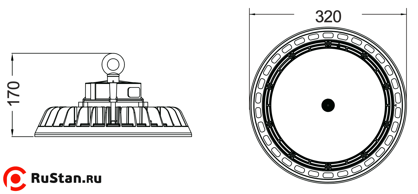 Размеры светильника с крюком, мм320х320х170