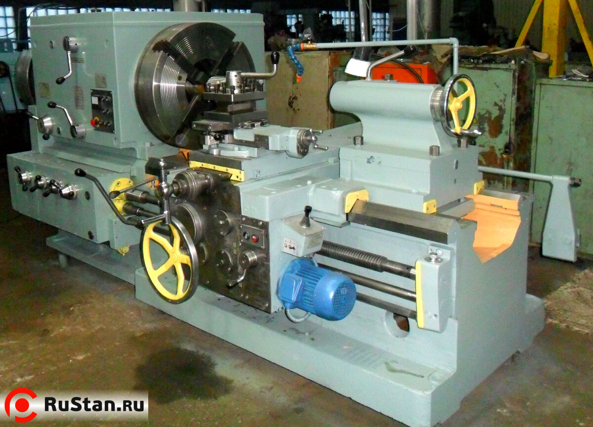 Станок 1М983 оснащен двумя механизированными четырех кулачковыми патронами диаметром 720 мм и напольным поддерживающим люнетом.